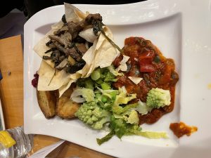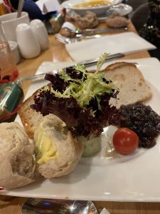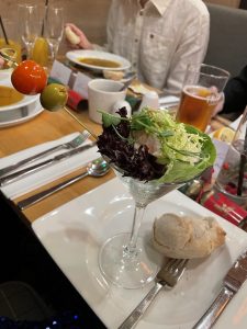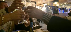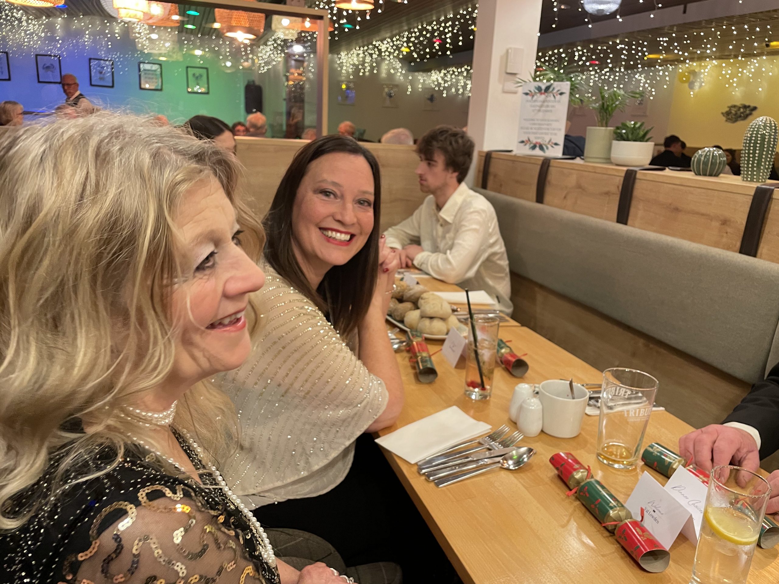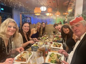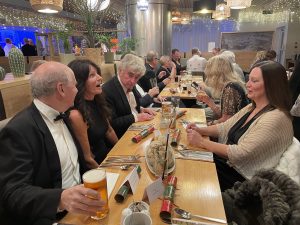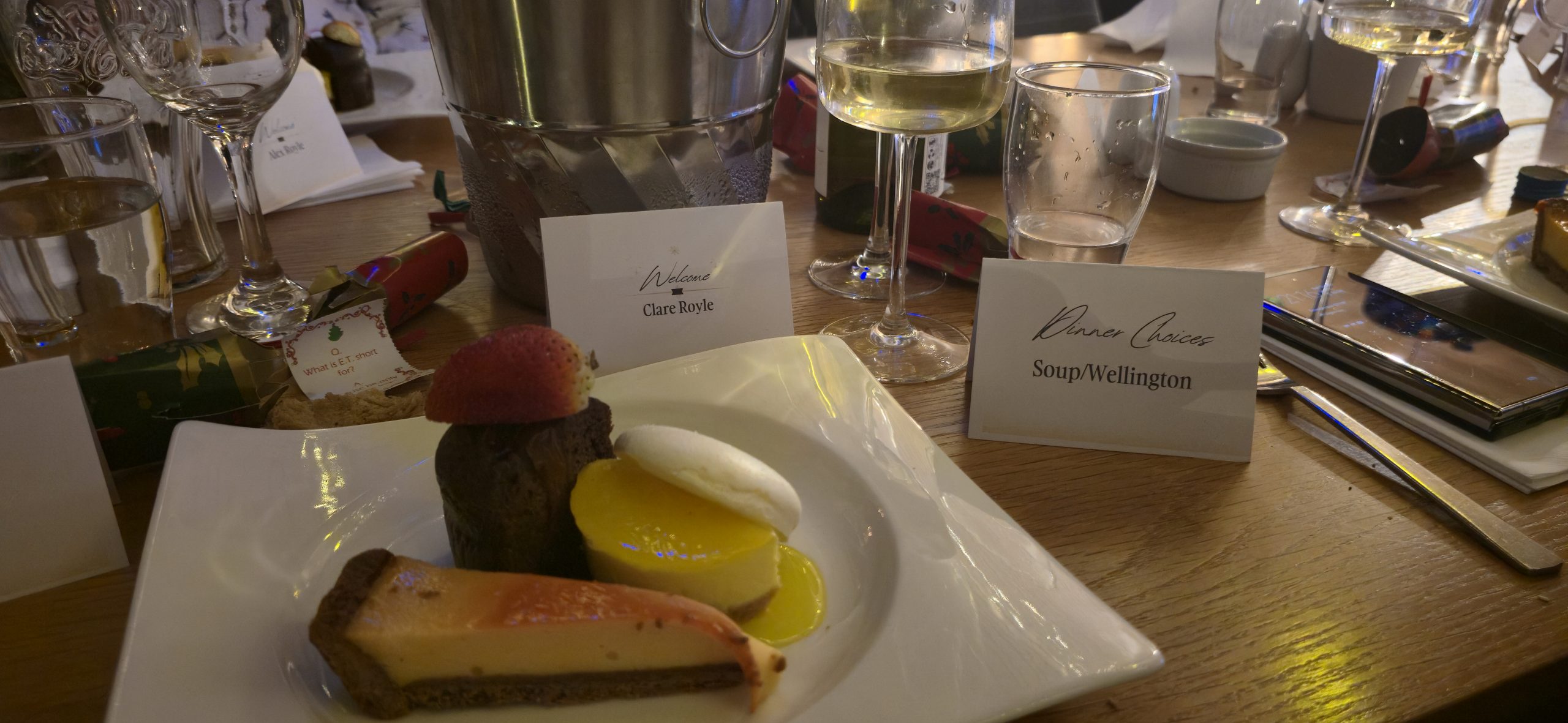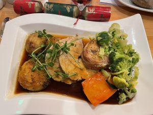 At 7:30pm we were asked to take our seats and serving began of our delicious starters. The main courses with side veg were tasty and plentiful and the medley of fruity, citrusy and chocolatey desserts were tantalising! Crackers were pulled, glasses were clinked, party hats were donned and jokes were told while enjoying our feast.